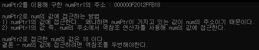 결과를 보면 일단 numPtr에 num의 메모리 주소가 제대로 들어가있습니다. 그러면 자료형이 다르다고 해서 메모리주소가 저장되지 않는건 아닙니다. 그리고 역참조 연산자를 통한 num에서 가져온 값의 출력을 보면 알수없는 값이 있네요. 이런 값이 출력되는 이유는 그전에 설명한것처럼 포인터를 역참조하면 선언한 자료형의 크기에 맞춰 값을 가져오기 때문에 이 상황에선 short(2byte 크기)에서 int(4byte 크기)만큼의 값을 가져오려고 하니까 당연히 값이 정상적으로 출력될 수 없겠죠.