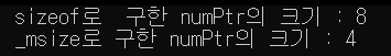 동적 메모리 할당을 통해 받은 공간을 알아내기 위해서는 sizeof연산자가 아닌 _msize 라는 함수(이 함수는 오직 동적할당된 변수에서만 사용할 수 있습니다.)를 사용합니다.