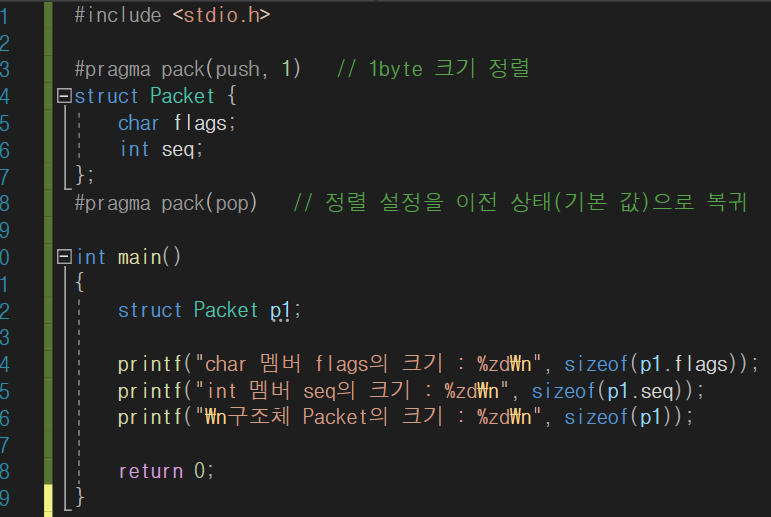 데이터 전송이나 저장을 할 때 구조체 정렬을 피하기 위해 각 컴파일러에서 제공하는 특별한 지시자를 사용해서 구조체 정렬 크기를 조절해줘야 합니다. 왜냐하면 C언어에서는 따로 구조체를 정렬하는 표준 방법이 없거든요.