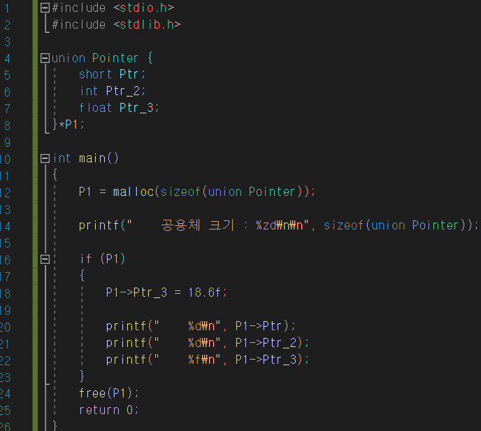 구조체와 마찬가지로 공용체도 포인터를 선언할 수 있고 또한 malloc 함수로 동적할당 할 수 있습니다.