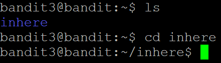 inhere 디렉토리에 숨겨진 파일로 있다고 하니 일단 'cd 명령어'를 사용해 inhere 이라는 디렉토리로 이동하겠습니다.