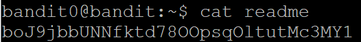 [The password for the next level is stored in a file called readme located in the home directory. Use this password to log into bandit1 using SSH. Whenever you find a password for a level, use SSH (on port 2220) to log into that level and continue the game.]