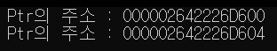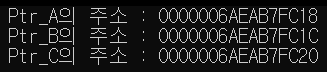 포인터 연산은 포인터 자료형의 크기만큼 더하거나 빼는 연산을 수행합니다. 그렇기 때문에 + 1을 한 주소값이 0000006AEAB7FC19가 아닌 0000006AEAB7FC1C가 나오게 되는 겁니다. 즉, Ptr_A + 1의 의미는 메모리 주소에서 int(4byte)만큼 1번 순방향으로 이동한다는 의미입니다.