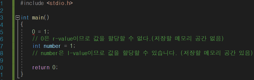 이해하기 어렵다면 변수를 선언할 때의 위치를 생각하면 되요. l-value는 변수 선언의 왼쪽에 위치한 변수를 의미하며, r-value는 변수 선언 오른쪽에 위치한 literal 값을 의미합니다.