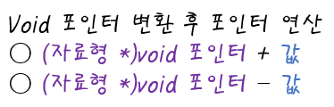 void 포인터는 자료형의 크기가 정해져있지 않기 때문에 +, -로 연산해도 얼마나 이동할지 알 수 없습니다. 따라서 포인터 연산 또한 불가능하죠.