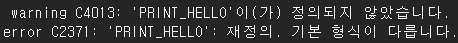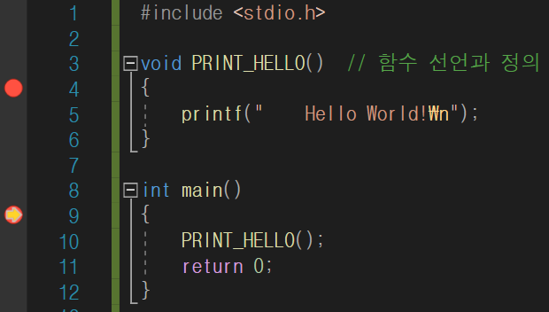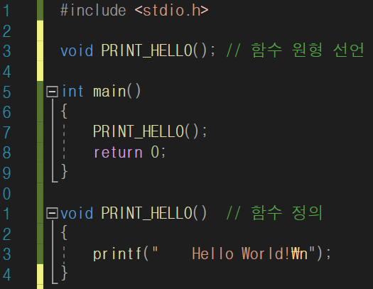 여기서 main 함수는 프로그램이 시작되었을 때 가장 먼저 실행되는 함수입니다. 그래서 main 함수를 가장 앞에 위치시켜야 한다고 생각할 수 있습니다만 안타깝게도 잘못된 생각입니다. 왜냐하면 C언어가 절차지향 언어라 위에서 아래로 실행되기 때문이에요. 만약 생각하신 것처럼 main 함수가 가장 위에 위치한다면 PRINT_HELLO 함수를 호출할 때 PRINT_HELLO 함수는 아직 정의 되지 않았기에 컴파일러는 알지 못합니다.
