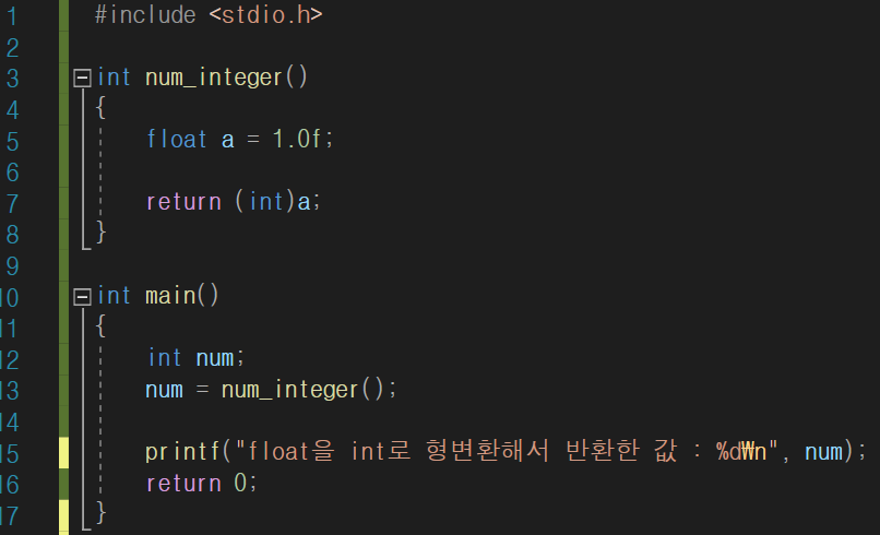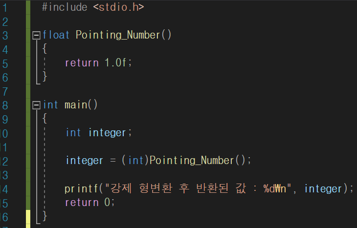 위에 반환값의 자료형과 반환하려는 값의 자료형이 다른 경우와는 달리 함수 반환값의 자료형과 반환값을 저장할 변수의 자료형이 다를 때도 있는데 이때도 컴파일 경고가 발생한다면 다음과 같이 함수 자체를 형변환 시킨 상태로 호출해서 반환값의 자료형을 강제로 변환합니다.