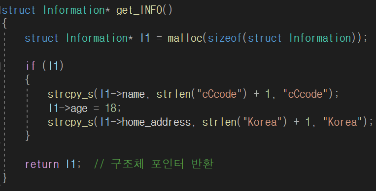 위 코드는 그전과는 달리 모든 내용을 복사한게 아니라 메모리를 할당한 뒤 메모리 주소가 들어있는 포인터만을 반환하여 사용하므로 구조체 내용을 모두 복사하지 않아 더 효율적입니다.