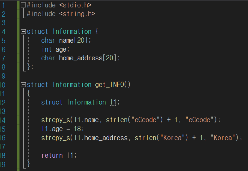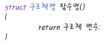 여기서 중요한 점 다른 함수들과는 다르게 반환값으로 구조체를 가지는 함수는 정의할 때는 struct 로 끝나지 않고 struct □□처럼 사용할 구조체 명을 함께 명시해야 합니다.