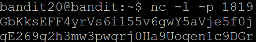 [There is a setuid binary in the homedirectory that does the following: it makes a connection to localhost on the port you specify as a commandline argument. It then reads a line of text from the connection and compares it to the password in the previous level (bandit20). If the password is correct, it will transmit the password for the next level (bandit21).]