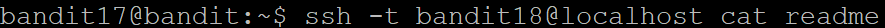 [The password for the next level is stored in a file readme in the homedirectory. Unfortunately, someone has modified .bashrc to log you out when you log in with SSH.]
