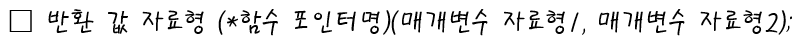 함수 포인터는 먼저 함수의 반환 값 자료형을 지정해주고, 함수 포인터명 앞에 *(Asterisk)를 사용한 뒤 괄호로 묶어줍니다. 그리고 다시 괄호를 사용해 함수임을 명시해줍니다.