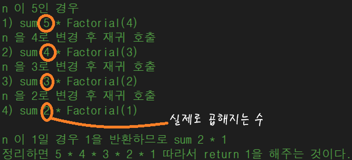 재귀함수를 통해 흔히들 아는 팩토리얼을 구현해보겠습니다. 혹시나 모르는 분들을 위해 팩토리얼이란 1부터 n까지의 숫자를 곱한 값이며, 기호로는 ! 를 사용합니다. ex) 5! = 5 x 4 x 3 x 2 x 1 = 120