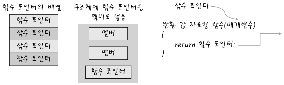 다시 한번 말씀드리지만, 함수 포인터를 선언할 때는 함수 포인터와 저장될 함수 간의 반환 값 자료형, 매개변수 자료형과 개수가 일치해야 합니다. 함수의 메모리 주소를 함수 포인터에 저장할 때 함수명 뒤 괄호를 사용하면 함수가 호출되기 때문에 주의해야합니다. 저장한 함수를 호출하려면 단지 함수 포인터 자체를 호출하면 됩니다. 즉, 함수 포인터를 사용하면 자동차의 타이어를 교체하는 듯이 함수를 교체할 수 있습니다.