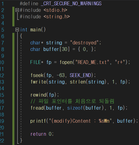 fseek 함수를 사용해 파일 포인터의 위치를 설정한 뒤 내용을 부분적으로 읽어보겠습니다.