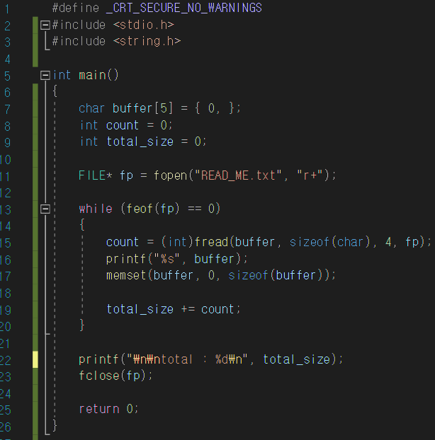 fread 함수를 이와 같이 설정해줘야 합니다. 3 x 3 = 9 만큼 읽는 건데, 그 이유는 그전에 설명드린 것처럼 파일의 크기에는 널 문자가 포함되지 않기 때문입니다. 그리고 total_size 는 이렇게 나온 count(= 파일의 일부 크기)를 모두 더해 파일의 총 크기를 구하는 역할입니다.