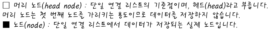 다른 노드를 가리키는 포인터가 하나씩만 있는 리스트를 단일 연결 리스트(singly linked list)라고 합니다.단일 연결 리스트에서 노드의 종류는 크게 두가지가 있으며, 역할은 다음과 같습니다.