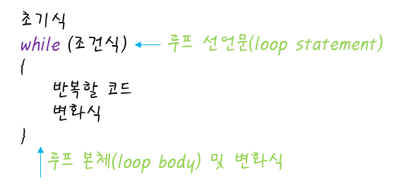 while 반복문은 안에 조건식만 들어가고 초기식은 반복문 바깥에 있습니다. 그리고 중괄호 안에 반복할 코드와 변화식이 함께 들어갑니다.