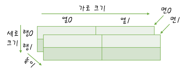 3차원 배열은 높이x가로x세로 형태로 이루어져있습니다.