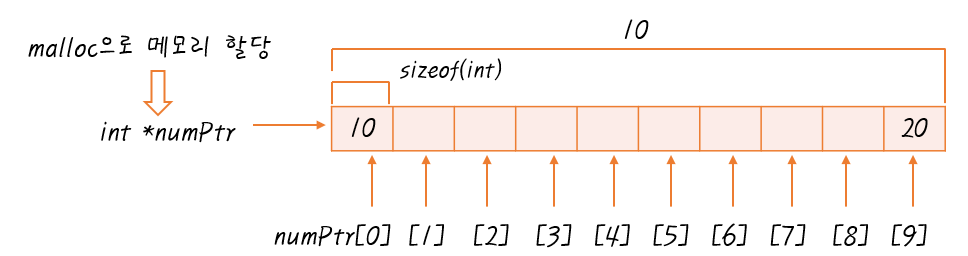 이처럼 malloc(sizeof(int) * 10);과 같이 int 크기에 10을 곱하여 동적으로 메모리를 할당합니다. 그리고 배열처럼 [ ] 안에 인덱스를 지정하여 값을 할당하거나 가져올 수 있습니다. 즉, 배열과 메모리가 할당된 포인터는 생성방법만 다를 뿐 값을 다루는 방법은 배열과 동일합니다. 또한, 포인터는 사용한 뒤 free함수로 해제 해준다는 게 다르겠네요.