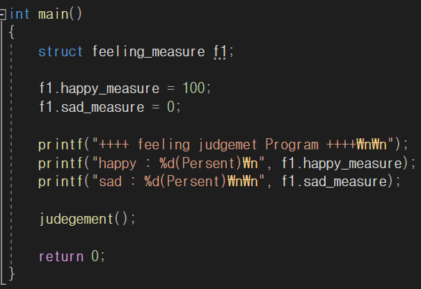제가 만든 프로그램의 일부입니다. 아까 설명드린대로 지역변수는 main 함수 즉, 선언한 함수 내에서만 쓸 수 있기에 외부 함수 judgement에서 f1(구조체 변수)를 이용해 구조체에 접근할 수 없는겁니다.
