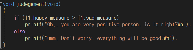 전역변수는 어디에도 속하지 않았기에 모든 곳에서 사용가능합니다. 따라서 main함수 외부 함수인 judegement에서도 f1(구조체 변수)를 이용해 구조체에 접근할 수 있는 것이죠.