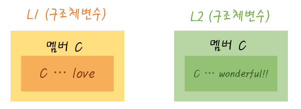 여러분들이 위의 코드들을 보고 l1 과 l2 즉, 구조체 변수들이 각각 자기만의 구조체를 가지고 있다는 사실을 알아채셨다면 여러분들도 성장하신겁니다.