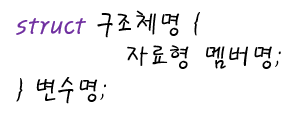 구조체는 정의만 해서 사용할 수 없고 ○ struct 구조체명 변수명; 형태로 구조체변수를 선언해 사용해야합니다.