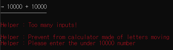 연산자와 숫자들을 입력해주라는 문구가 출력됩니다. 이 때, 10000 이상의 숫자나 % 연산자를 사용할 경우 다시 입력하라는 메세지와 함께 입력 화면으로 돌아오게 됩니다.