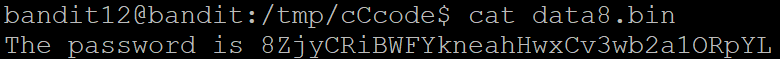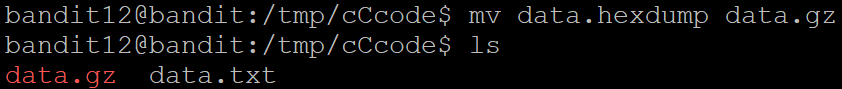 [The password for the next level is stored in the file data.txt, which is a hexdump of a file that has been repeatedly compressed. For this level it may be useful to create a directory under /tmp in which you can work using mkdir. For example: mkdir /tmp/myname123. Then copy the datafile using cp, and rename it using mv (read the manpages!)]