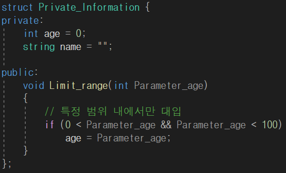 이 경우에는 함수를 호출하고 매개변수로 준 값을 변수에 대입했습니다. 하지만 만약 함수가 아닌 변수에 바로 값을 대입할 경우 범위를 제한할 수 없는 그러니까 원하지 않는 결과가 나올 수 있습니다. 그래서 C++ 에선 접근 제어 지시자를 제공합니다.